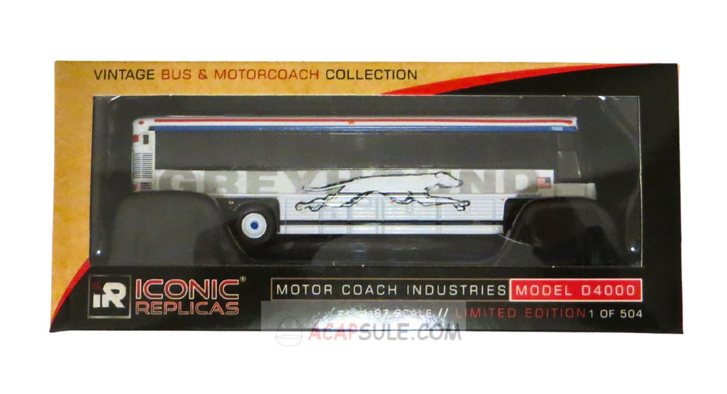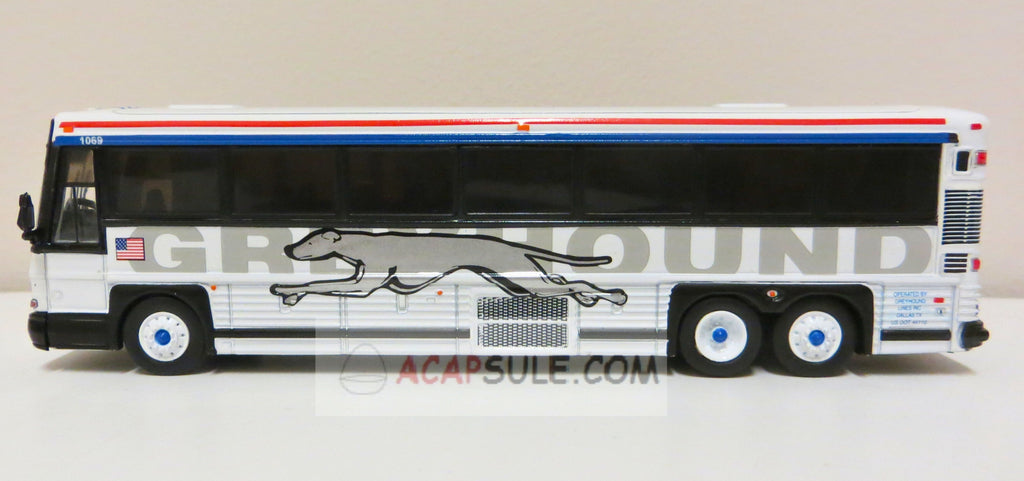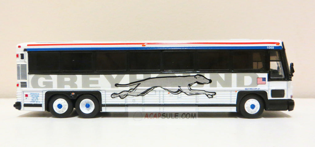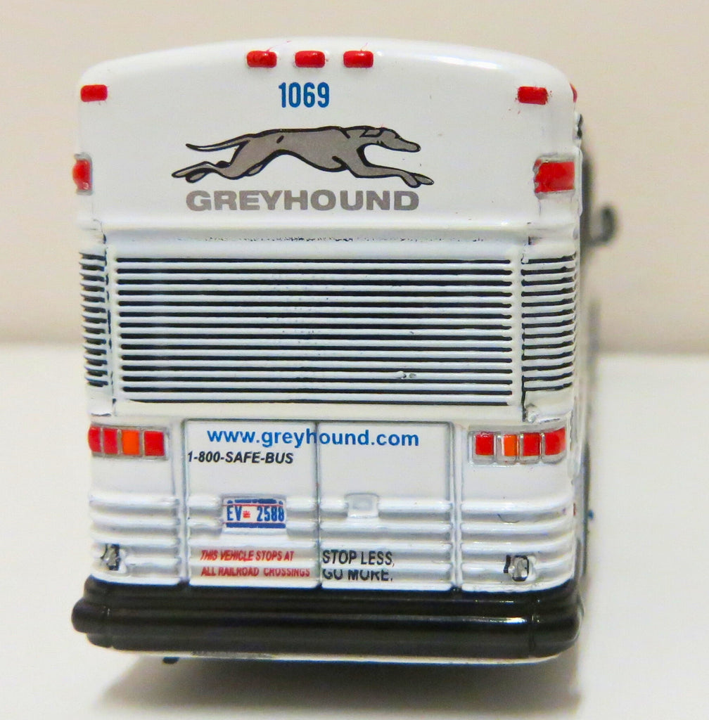 Greyhound Shadow Livery - 1/87 Scale MCI D4000 Diecast Model Bus. Destination Sign says Local and Bus is numbered 1069